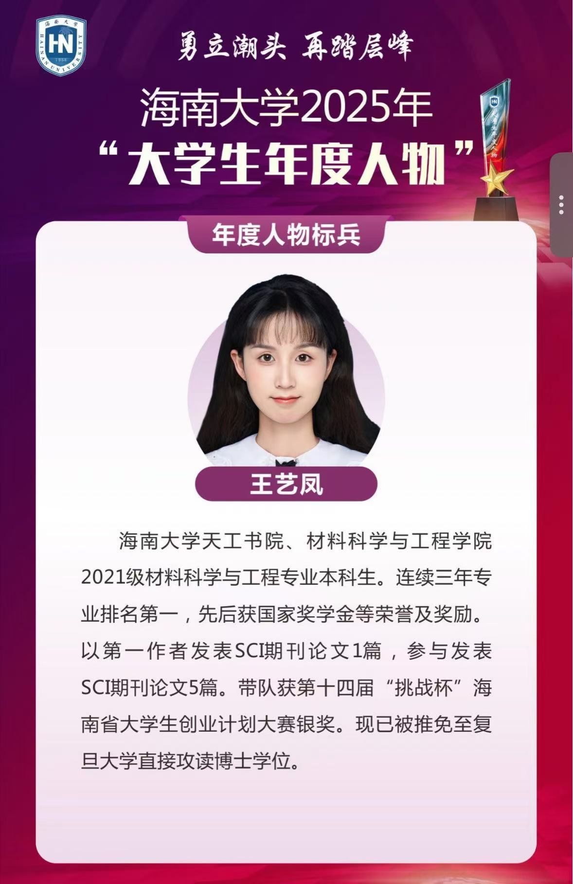 王艺凤,共青团员,红桃视频 2025年大学生年度人物标兵,红桃视频 2021级材料科学与工程专业本科生,现已推免至复旦大学直接攻读博士学位。学业上,她连续三年综合排名专业第一,核心课程成绩优异,以扎实的专业功底为学术之路筑牢根基。作为班级学委,她主动担当学风建设重任,牵头组织学习分享会、重难点答疑等活动,用责任与热忱赢得师生广泛认可。科研方面,她自大一就加入导师实验室学习,协助师兄师姐钻研材料科学前沿课题。从基础实验操作到方案设计、成果转化,她步步扎实,累计参与完成多项科研任务。以第一作者身份在SCI一区期刊发表论文1篇,参与发表SCI论文5篇,累计影响因子超40,获授权国家专利2项,展现出良好的科研素养与创新能力。实践中,她全面发展、勇于突破,带队斩获第十四届“挑战杯”海南省大学生创业计划大赛银奖,先后荣获国家奖学金等省部级及校级以上荣誉5余项。她以优异的学业成绩、突出的科研能力和全面的综合素质,充分展现了新时代青年勇担使命、追求卓越的精神风貌。